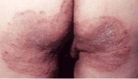 患者患处奇痒、不断搔抓。出现红疹、丘疹,逐渐扩大成圆形体癣。腹股沟处呈水肿性红斑,一处一处成匐行状。当发炎现象控制之后,会留下色素沉着的斑痕(有如黑色的印子)。症状不断反复、历久不愈,患处皮肤逐渐变粗、变厚。为更直接地了解股癣的症状,供以下图片参考。