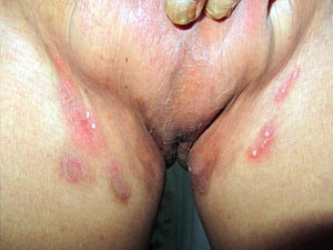 患者男,70岁,以“大腿根部瘙痒、摩擦痛1月余”为主诉就诊。