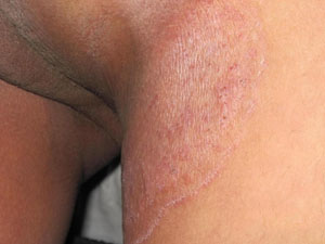 患者一个月前,无明显诱因出现大腿根部瘙痒伴摩擦痛,无明显昼夜差别,皮损初为环形,长期搔抓后呈不规则形,此起彼伏。为求治,即来就诊。