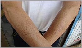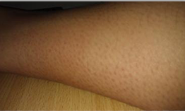 2、鸡皮肤的发生率高,主要好发於上手臂外侧面、大腿伸侧面,严重时,甚至连手肘外侧面、小腿伸侧面都会有,看起来会像是有角质堆积在毛囊开口的现象,厉害时还会有周围发红或肿胀的现象